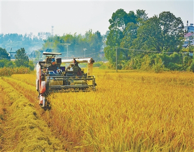 10月12日,在安徽省安庆市岳西县温泉镇,农机手驾驶收割机收割水稻。 |