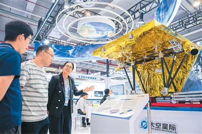 在株洲国际会展中心,工作人员(左三)在介绍一台对地观测卫星。 |