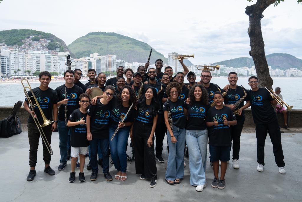2024年12月14日,在巴西里约热内卢,参加排练的科帕卡巴纳要塞乐团成员合影。新华社记者 王天聪 摄