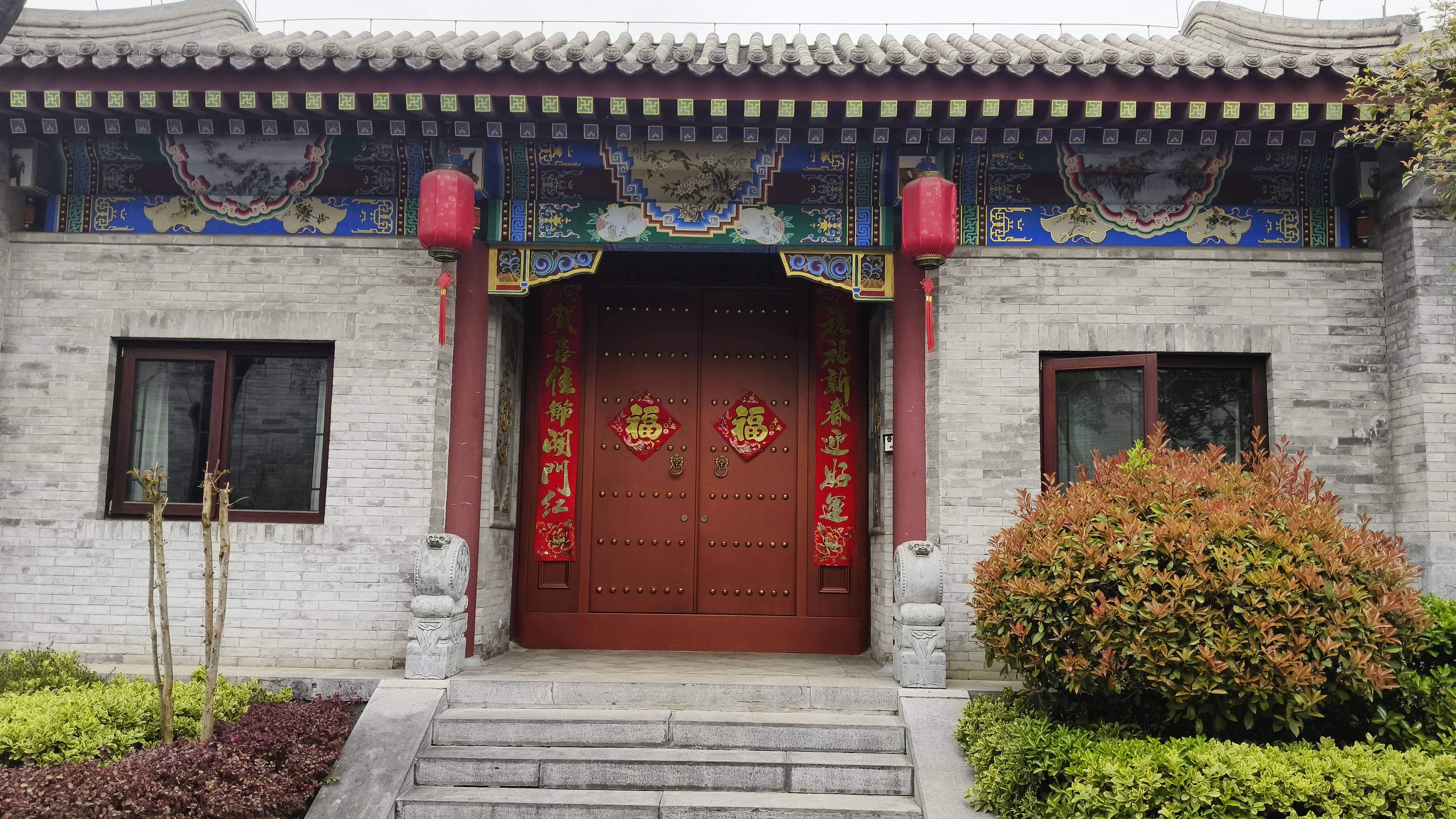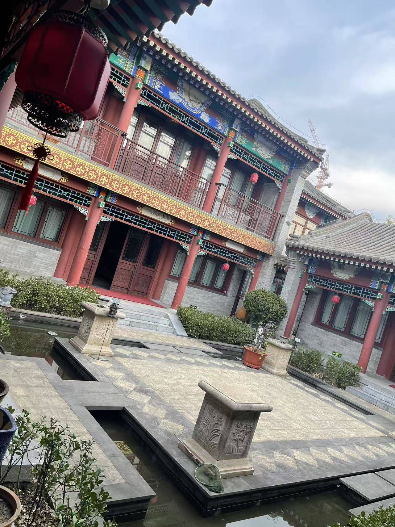 未入院中,其外观便已夺人眼目。畅春四合院民宿仿若从岁月深处走来,建筑风格尽得古建筑四合院之神韵。青砖墙,恰似“苔痕上阶绿,草色入帘青”所描绘的那般古朴悠然,虽历经风雨沧桑,却沉淀下厚重的历史质感;红柱子,擎天而立,鲜艳夺目,仿若“朱楼翠阁”重现人间,彰显着传统建筑的恢宏大气与庄重典雅。青瓦层层铺陈,如鱼鳞般错落有致,在日光轻抚下,投影出的细密纹路,恰似岁月镌刻的密码。仿古梁绘画精美绝伦,花鸟鱼虫、山水人物跃然其上,仿若“画栋朝飞南浦云,珠帘暮卷西山雨”之景活现,每一笔皆蕴含古人对美好生活的诗意期许,神秘幽远,引人入胜,让人不禁沉醉于这浓厚的历史文化氛围之中,仿若穿越千年,踏入古韵悠长的旧时光。